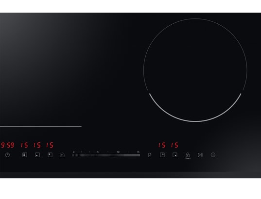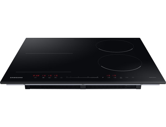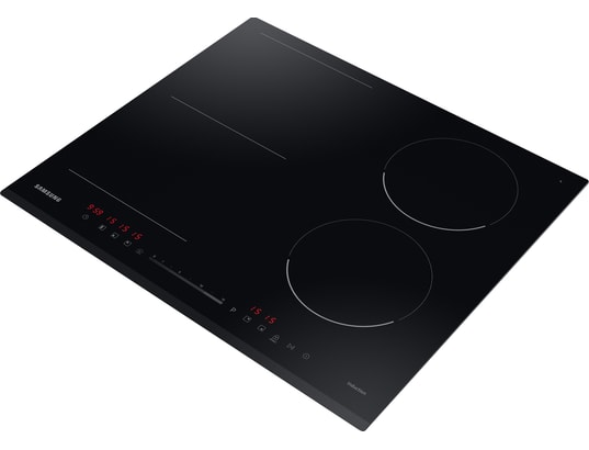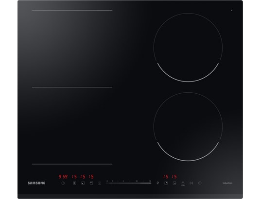 La table à induction 4 foyers NZ64R3747BK de Samsung allie puissance, précision et flexibilité dans un design raffiné en verre noir à bord biseauté.