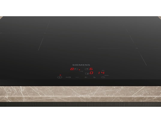 La plaque à induction EH631BJB6E, de Siemens, dispose de la fonction powerBoost, disponible sur chaque foyer. Elle permet un accès direct à la puissance maximale et apporte une montée en température, ultra rapide et un gain de temps.